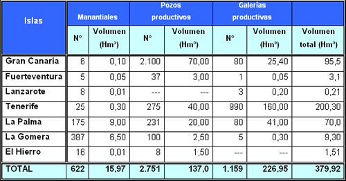 La producción de aguas subterráneas en cada isla es distinta, ya que también son distintas sus condiciones de pluviometría y geología.